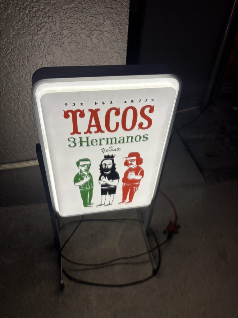 「TACOS 3Hermanos(タコス トレス エルマノス)」Google先生の翻訳によるとスペイン語で「タコス3兄弟」という意味のようです。3兄弟はこの3人の男性のことなんですかね。
