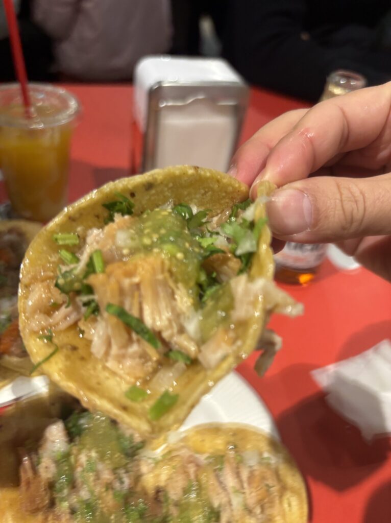 まずはカルニタスからいただきます。上にあるライムを絞って1口でパクリ。口に入れるとまずはトルティーヤからとうもろこしの味がすることにすごく驚きました。トルティーヤってこんなにとうもろこしの味がするのね。めっちゃ香ばしくて美味いやん。
