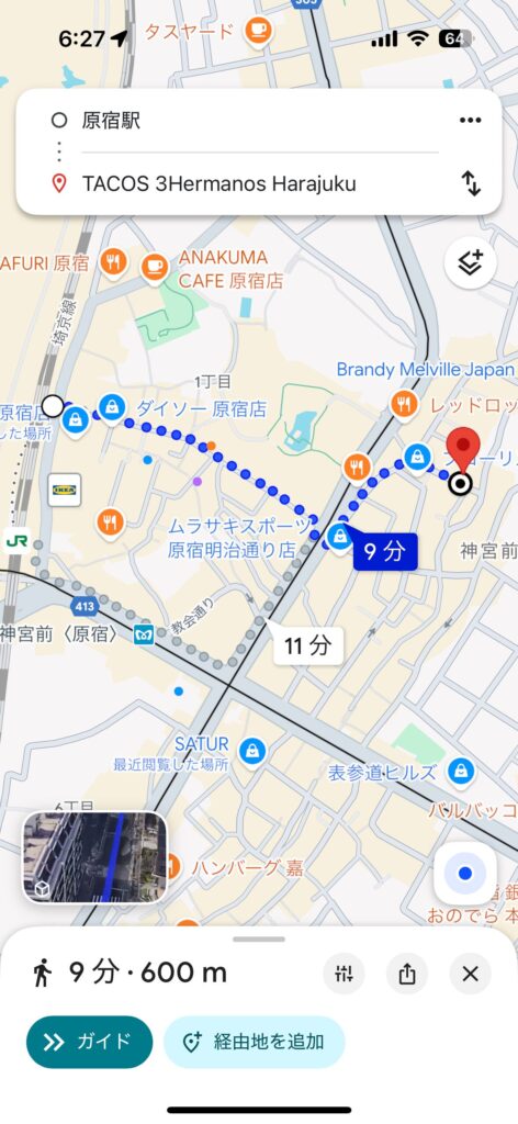 駅から徒歩で9分となっていますが竹下通りの混雑を考えると15分くらいはみておいてもいいかもしれないです。週末の竹下通りは普通のスピードでは歩けないですからね。