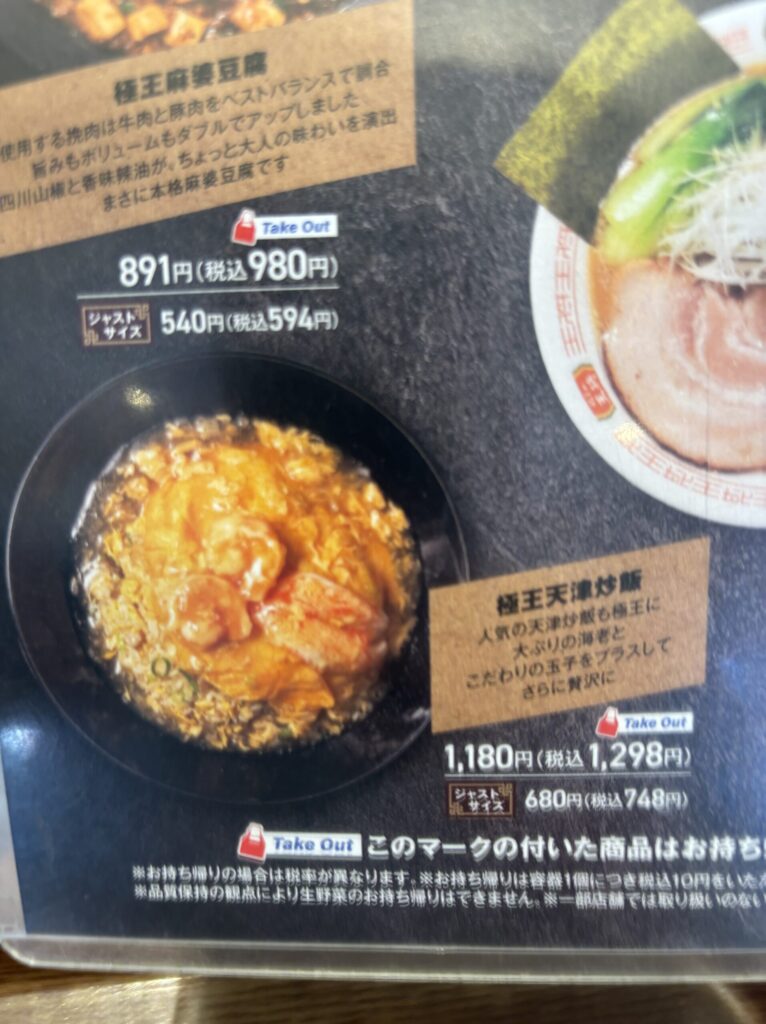そんな!あの極王シリーズに天津炒飯が爆誕しているではありませんか。めちゃくちゃ気になるー!価格は1,180円(税抜き)。通常の天津炒飯の740円(税抜き)の約1.6倍。給料日前のランチで1,000円オーバーは正直厳しいところですが、ここは泣く泣くジャストサイズ餃子を諦めましょう。