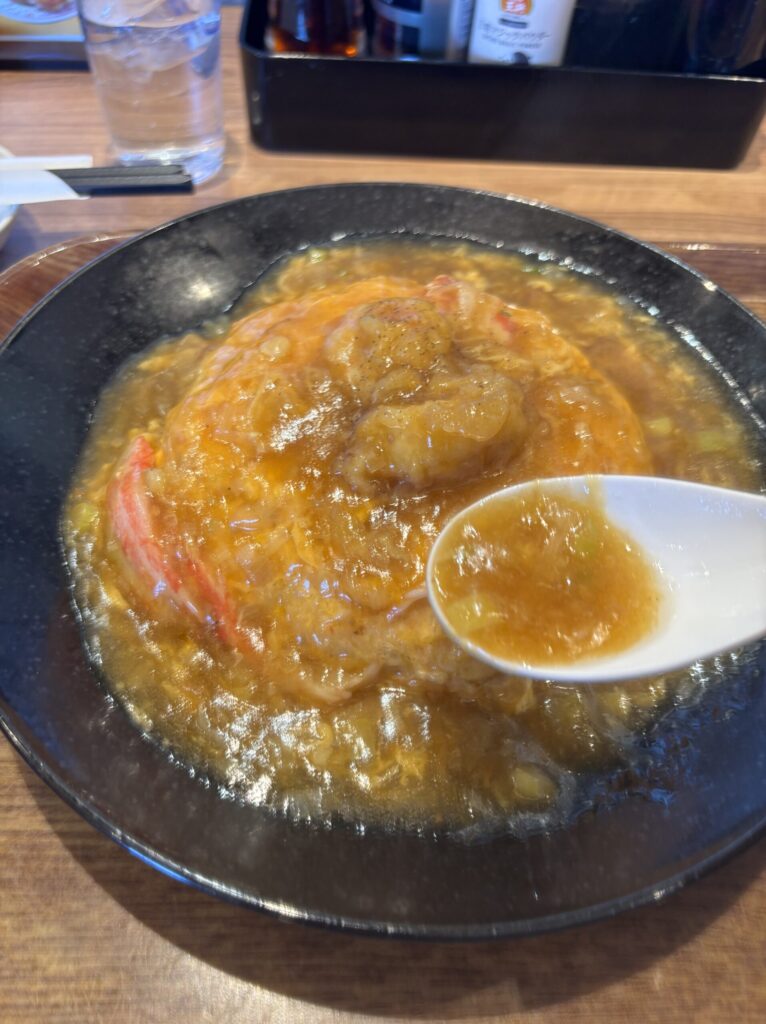 通常の天津炒飯って餡の味が甘酢餡、塩だれ餡、京風餡の3種類あって、好きな餡を選ぶことができるのも魅力のひとつなんですよ。聞かれないということは極王天津炒飯は餡の味が固定ということか。ふむふむ。これは餡には相当の自信があるということの表れですね。では、まずは餡だけでいただいてみましょう。