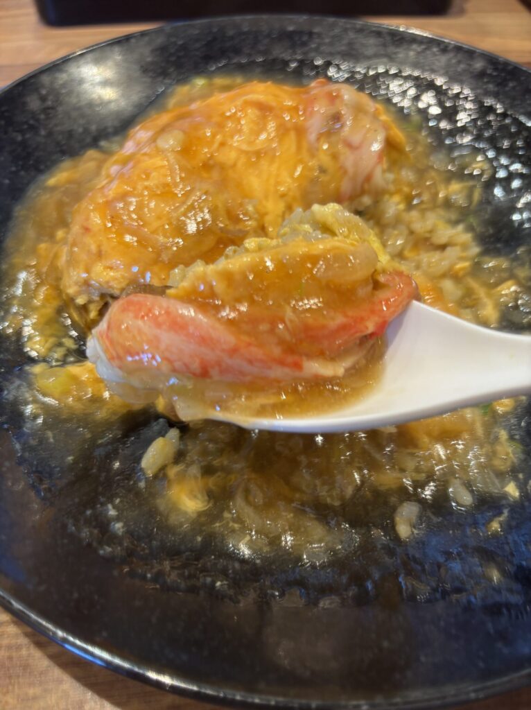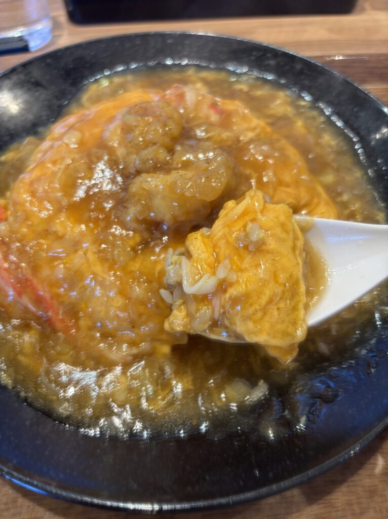 次は炒飯と一緒に一口パクリ。完璧ですね。しっかりと味付けされたの炒飯を優しい餡が包み込むことで、ちょうどいい塩梅になり最高のハーモニーが生まれています。これはもう飲み物なのかもしれません。